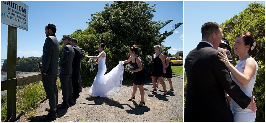 I had the most amazing day taking photos of Mr. & Mrs. Jay & Libby walker. Everyone was lovely to work with and started showing their funny sides as the day progressed. The bride and groom had there photos taken before the wedding ceremony, this is called the FIRST LOOK and means the guests aren’t left waiting and gives lots of photo time. Libby & the girls got ready in a very nice beachfront property in Opunake, which provided a lovely background for photos. At 2.00 pm the girls headed off to meet with the boys for the first look at a lovely spot in Opunake overlooking the ocean. The boys faced out to sea as Libby walked up behind them and tapped the groom on the shoulder to turn around and see his lovely bride. It was so romantic. Special thanks to my lovely assistant Roanna Pahl you were awesome.